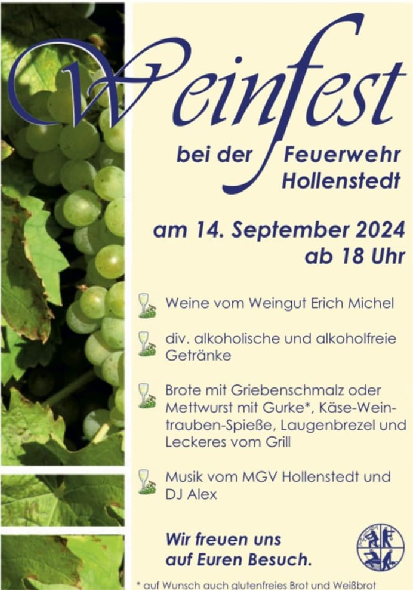 Weinfest bei der Feuerwehr Hollenstedt am 14. September 2024 ab 18:00 Uhr Weine vom Weingut Erich Michel div. alkoholische und alkoholfreie Getränke Brote mit Griebenschmalz oder Mettwurst mit Gurke*, Käse-Weintrauben-Spieße, Laugenbrezel und leckeres vom Grill *auf Wunsch auch glutenfreies Brot und Weißbrot Musik vom MGV Hollenstedt und DJ Alex Wir freuen uns auf Euren Besuch